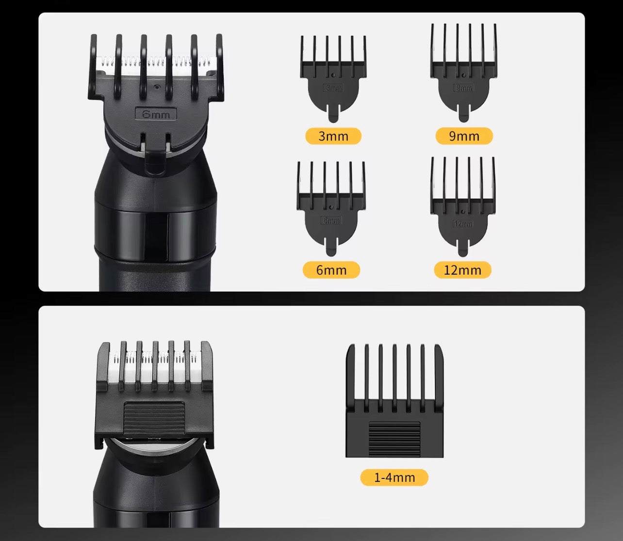 - 5 guide combs: 1-4mm, 3mm, 6mm, 9mm, 12mm